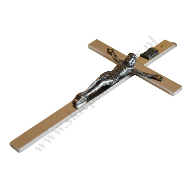 Krzyż metalowy niklowany z metalowym korpusem Pana Jezusa. Krzyż o wysokości 16 cm i szerokość ramion 8.5 cm.