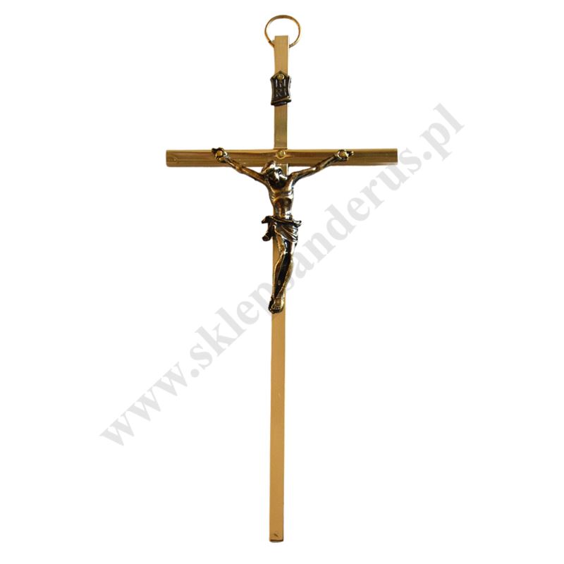 Krzyż metalowy mosiężny z metalowym korpusem Pana Jezusa. Krzyż o wysokości 17.5 cm i szerokość ramion 8 cm.