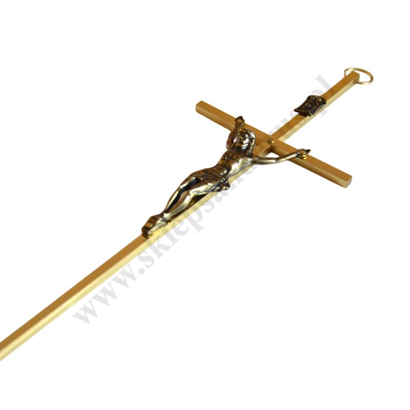 Krzyż metalowy mosiężny z metalowym korpusem Pana Jezusa. Krzyż o wysokości 25 cm i szerokość ramion 7.5 cm.