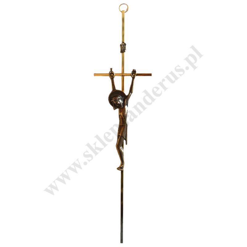 Krzyż metalowy mosiężny z metalowym korpusem Pana Jezusa. Krzyż o wysokości 32 cm i szerokość ramion 8 cm.