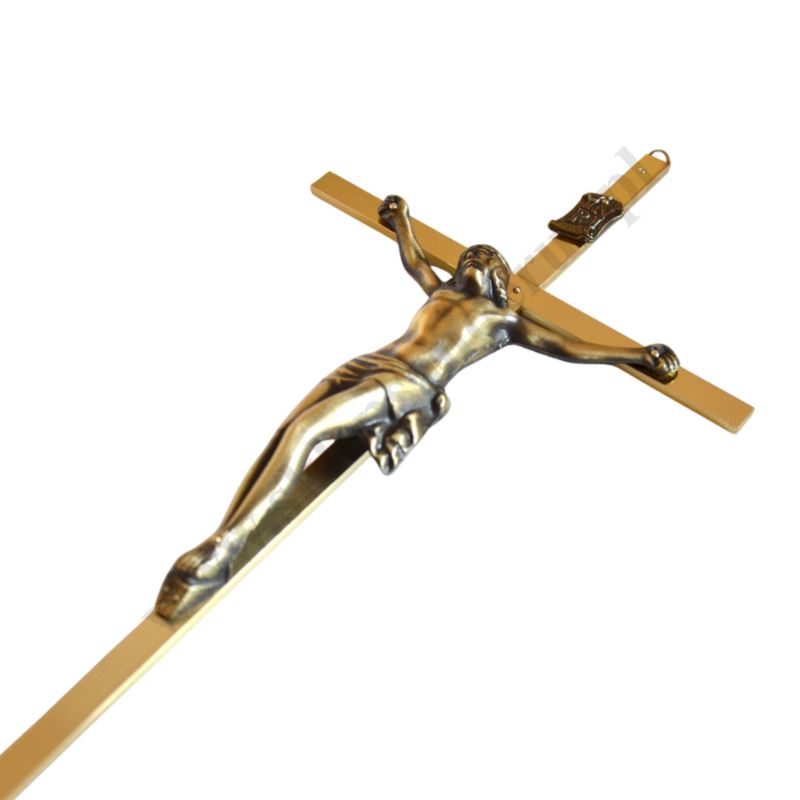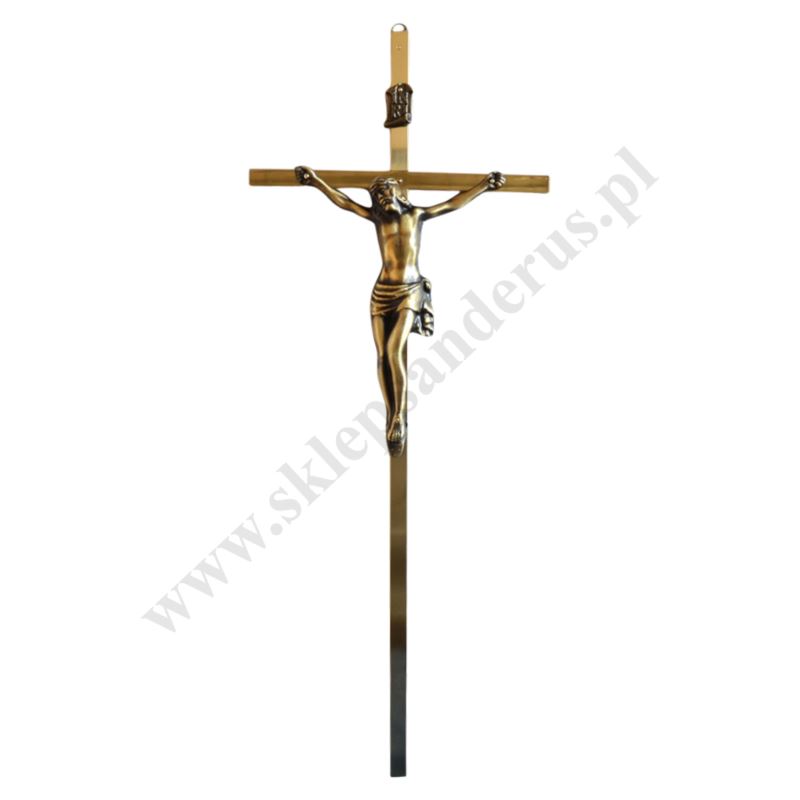 Krzyż metalowy mosiężny z metalowym korpusem Pana Jezusa. Krzyż o wysokości 43 cm i szerokość ramion 17 cm.