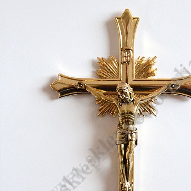 Krzyż wiszący metalowy, mosiężny o wysokości 19 cm.