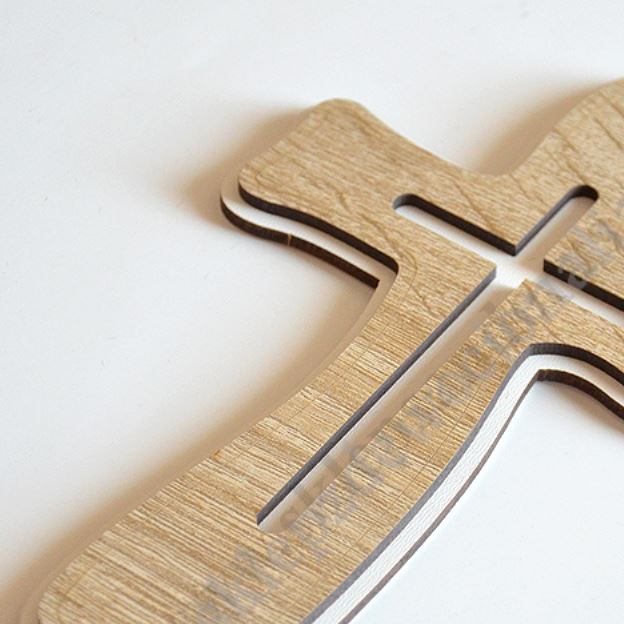 Krzyż nowoczesny wykonany z drewnianej sklejki z metalowym korpusem Pana Jezusa o wysokości 18 cm i szerokości 10.5 cm.