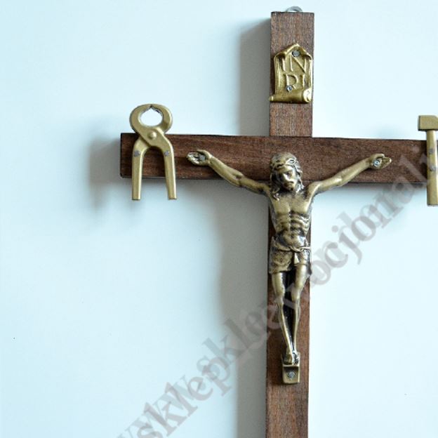 Drewniany krzyż saletyński o wysokości 27.5 cm i szerokości 16.5 cm z metalowym korpusem Pana Jezusa oraz metalowymi narzędziami na ramionach krzyża.