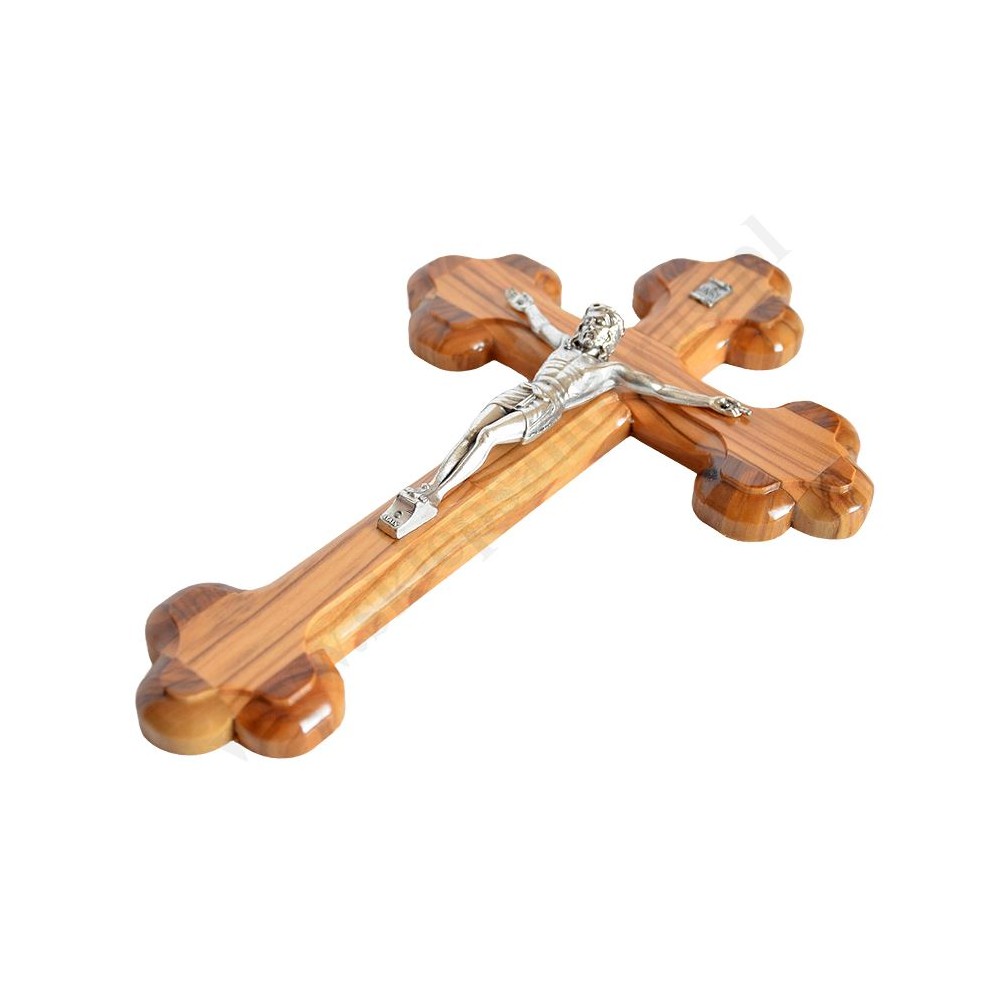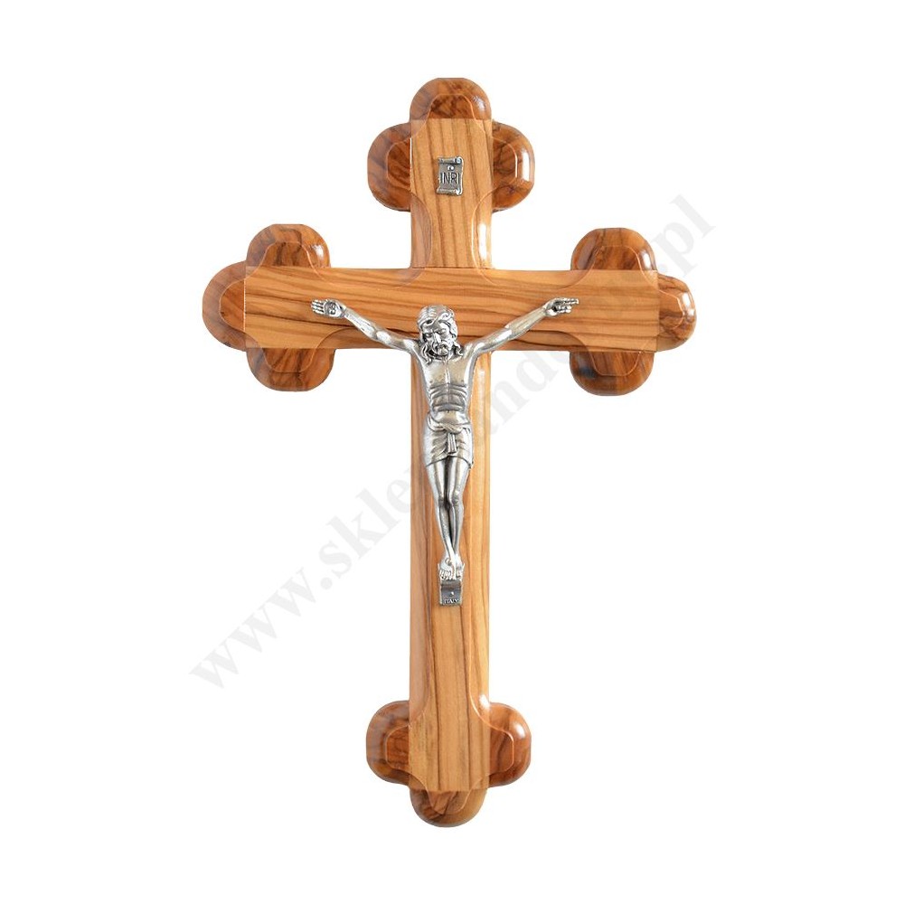 Krzyż wykonany z drzewa oliwnego z metalowym korpusem Pana Jezusa. Wysokość krzyża 22.7 cm, szerokość 15 cm.