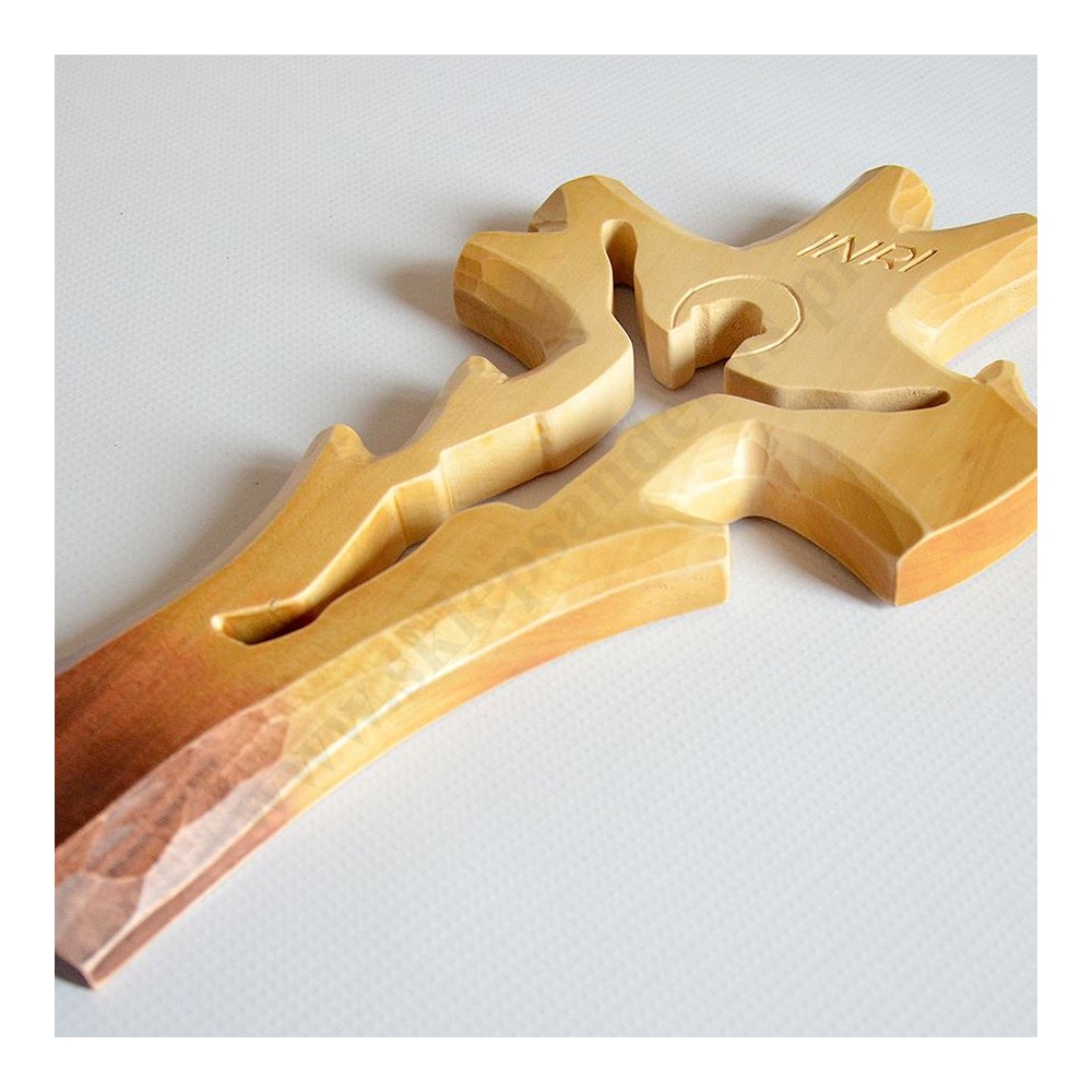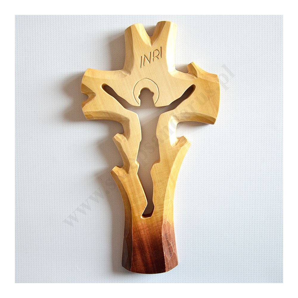Krzyż drewniany ręcznie rzeźbiony o wysokości 35 cm i szerokości 18.8 cm. Produkt może się różnić od tego prezentowanego na zdjęciu ze względu na ręczne wykonanie.