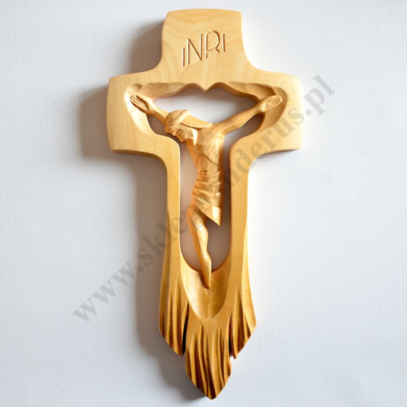 Krzyż drewniany ręcznie rzeźbiony o wysokości 39 cm i szerokości 19.5 cm. PONIŻEJ W PRODUKTACH POWIĄZANYCH ISTNIEJE MOŻLIWOŚĆ ZAMÓWIENIA OKAZJONALNEJ DEDYKACJI NA TABLICZCE SREBRNEJ LUB ZŁOTEJ