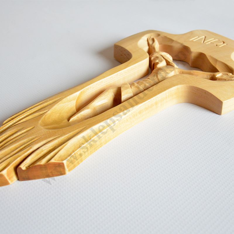 Krzyż drewniany ręcznie rzeźbiony o wysokości 39 cm i szerokości 19.5 cm. Produkt może się różnić od tego prezentowanego na zdjęciu ze względu na ręczne wykonanie.