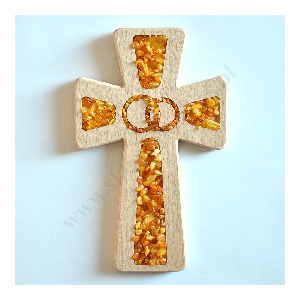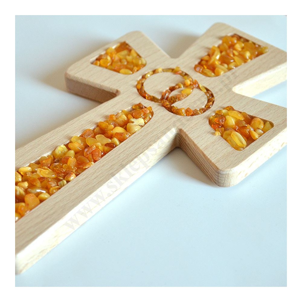 Krzyżyk drewniany zdobiony sztucznym bursztynem. Wysokość krzyżyka 20 cm, szerokość krzyżyka 12.5 cm.