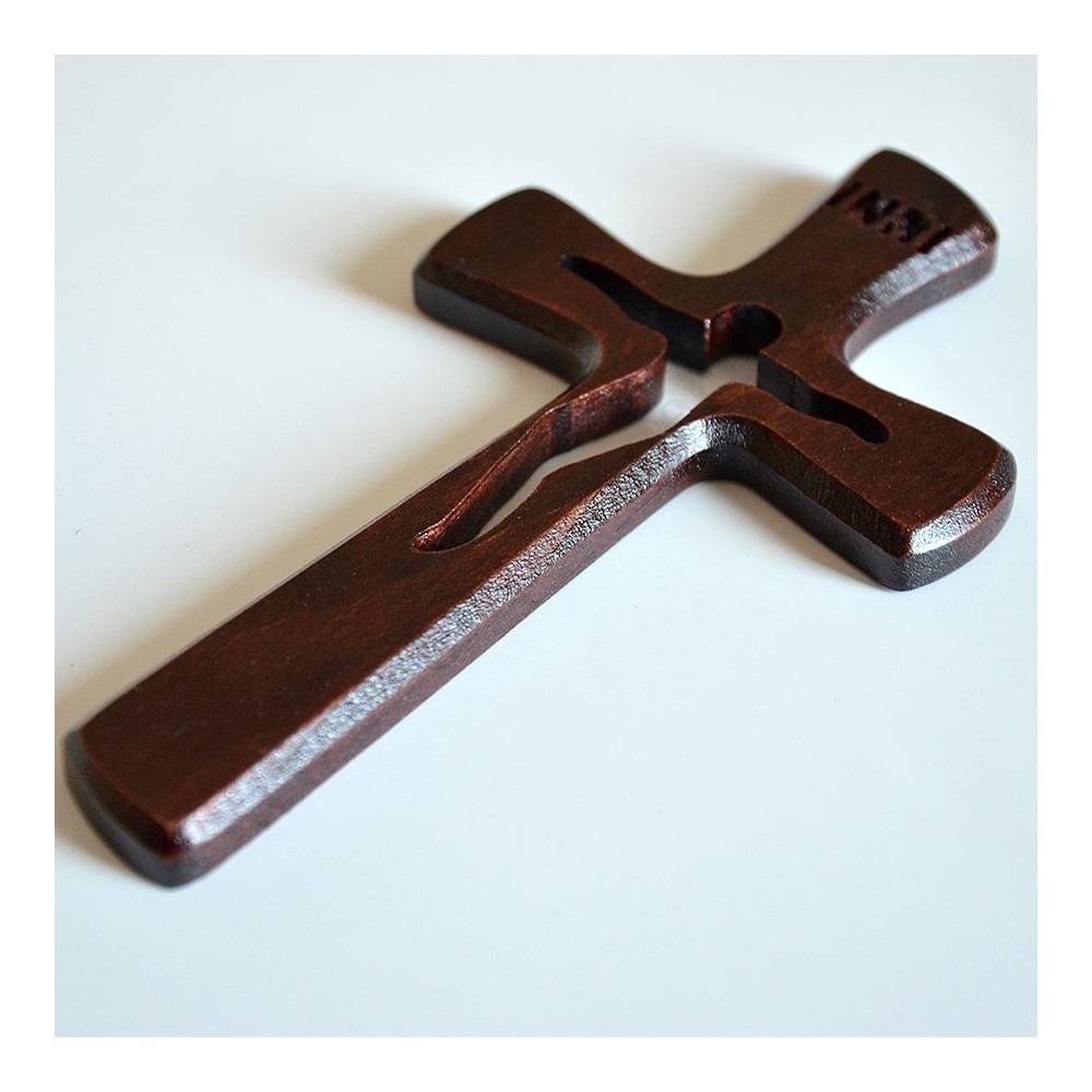 Krzyż drewniany o wysokości 15 cm, szerokości 8.3 cm.