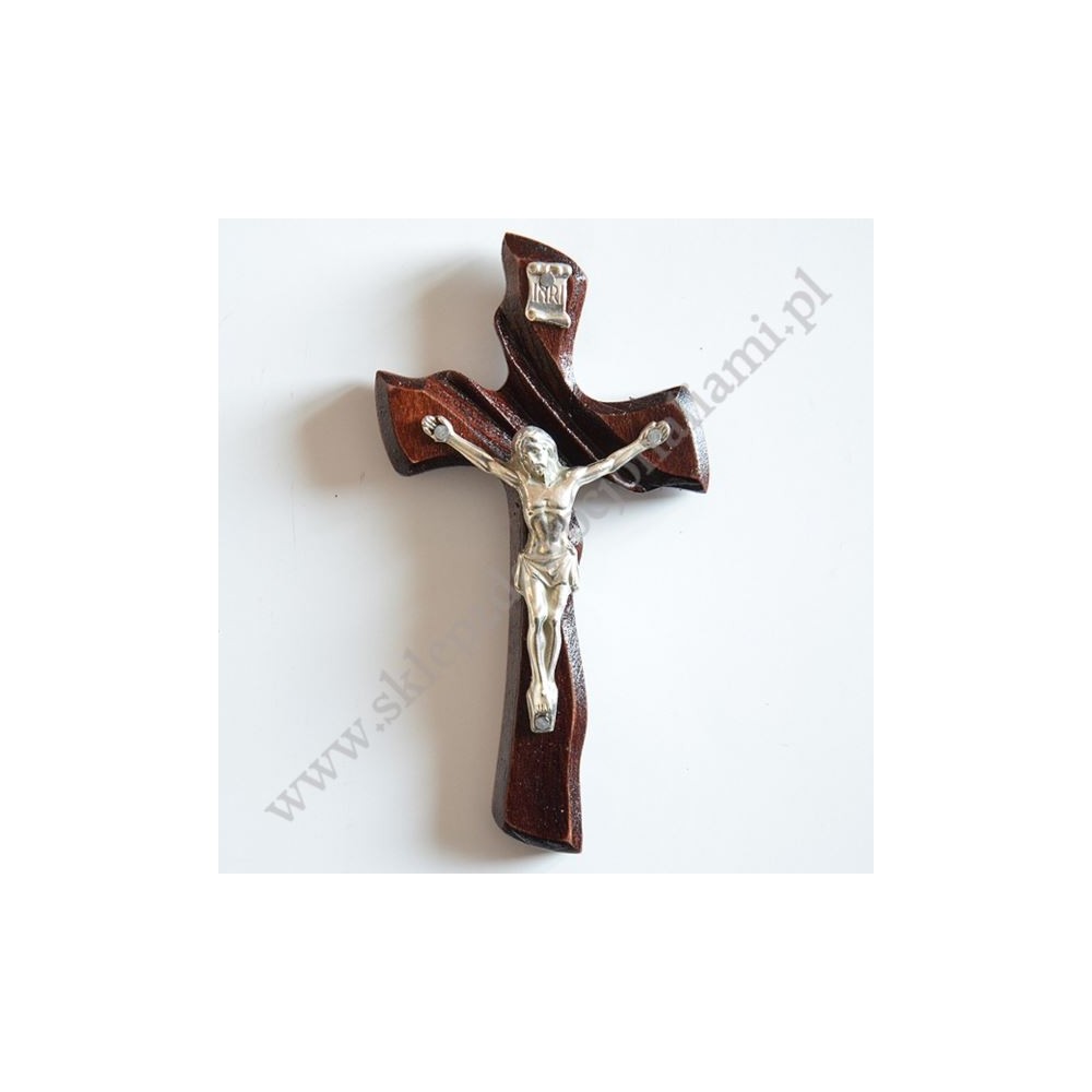 Drewniany krzyżyk o wysokości 12 cm i szerokości 7 cm z metalowym korpusem Pana Jezusa o wysokości 6 cm.