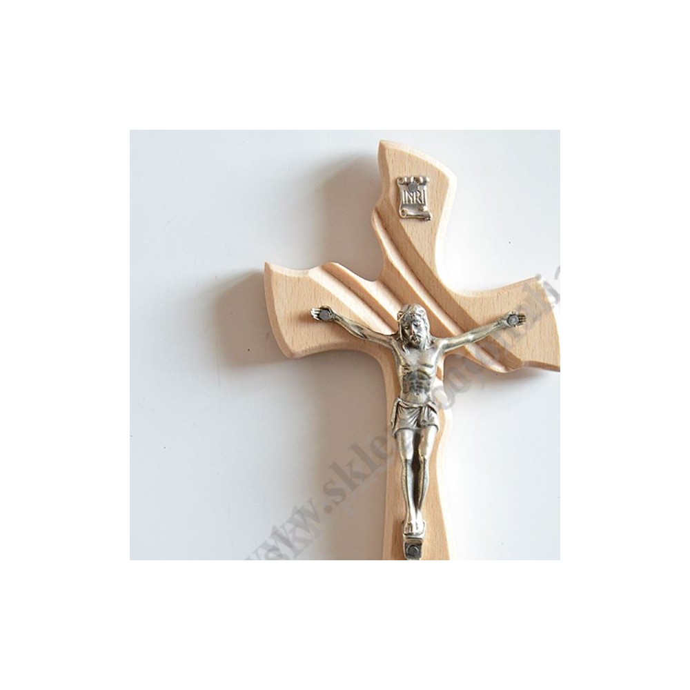 Drewniany krzyżyk o wysokości 15 cm i szerokości 8.5 cm z metalowym korpusem Pana Jezusa o wysokości 7 cm.