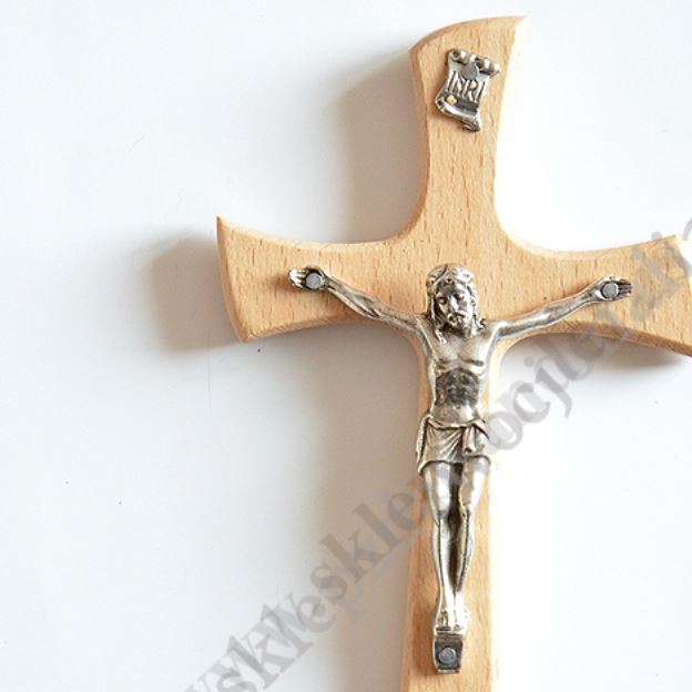 Drewniany krzyżyk o wysokości 15 cm i szerokości 8.5 cm z metalowym korpusem Pana Jezusa o wysokości 7 cm.