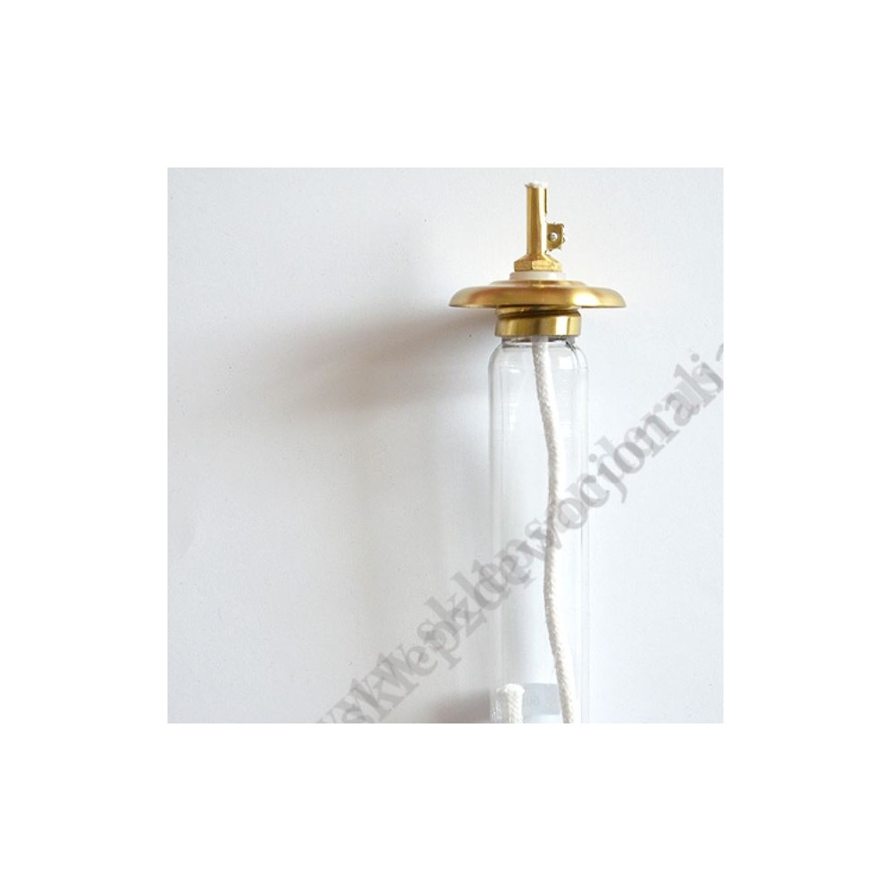 Regulowany wkład olejowy do świecy o średnicy wewnętrznej 3 cm, wysokość wkładu 18 cm (razem z talerzykiem), wysokość, która wchodzi do świecy 17.4 cm, średnica talerzyka 5.2 cm.