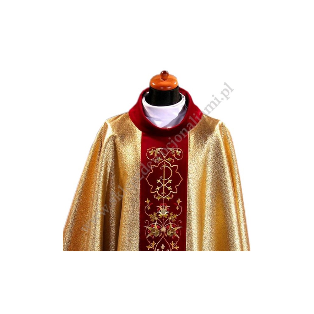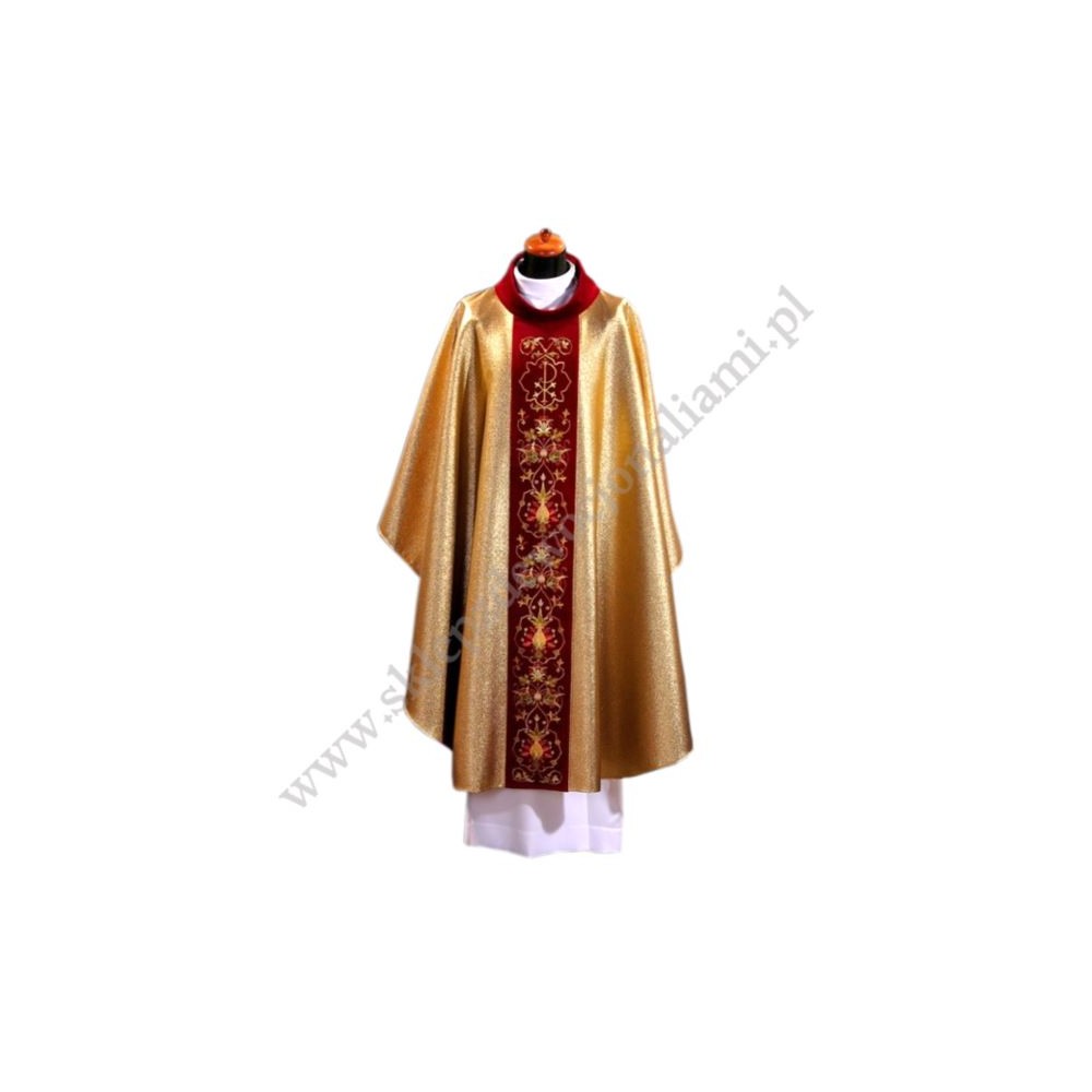 Ornat uszyty z tkaniny brokatowej z bogatym złotym haftem Eucharystycznym na szerokim aksamitnym pasie, kołnierz również aksamitny.