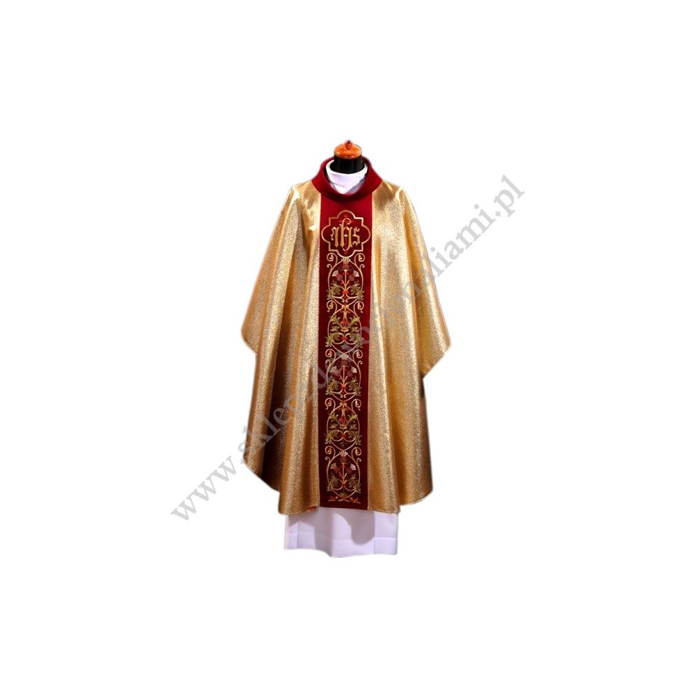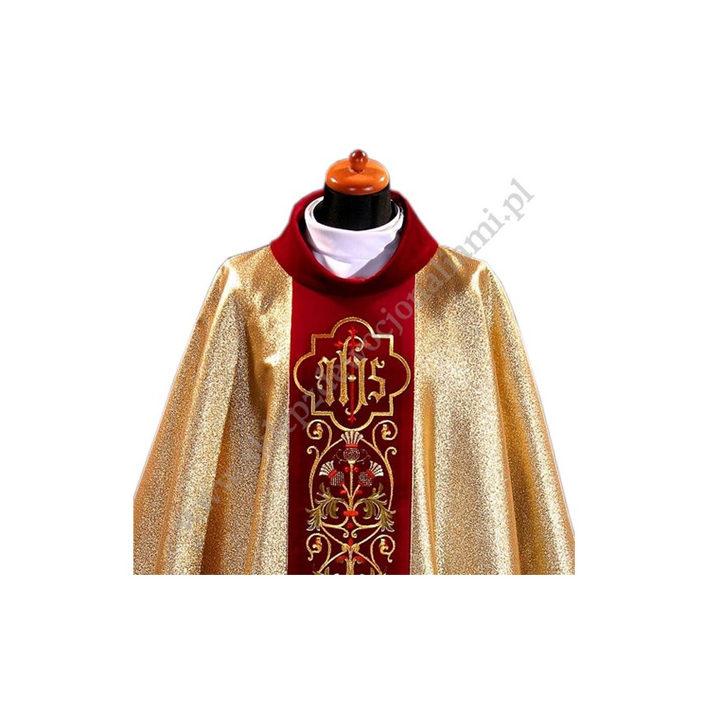 Ornat uszyty z tkaniny brokatowej z bogatym złotym haftem Eucharystycznym na szerokim aksamitnym pasie. Kołnierz przy ornacie również aksamitny.
