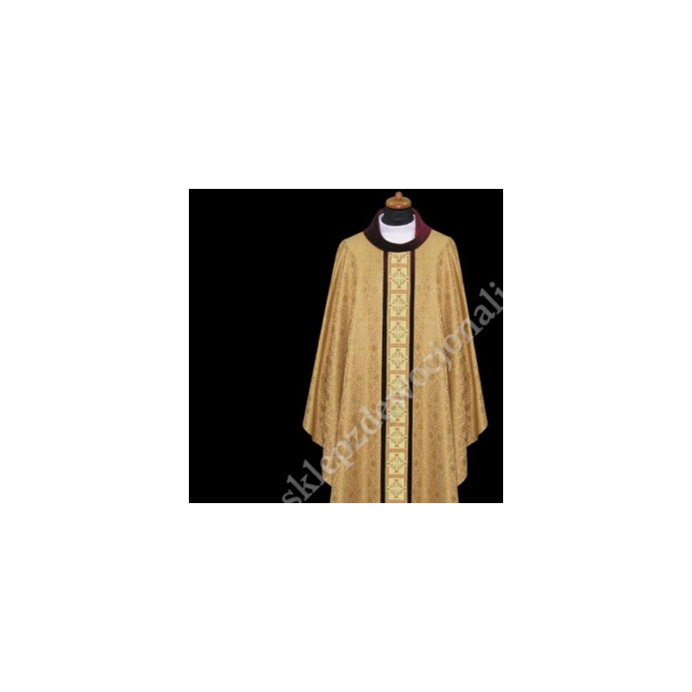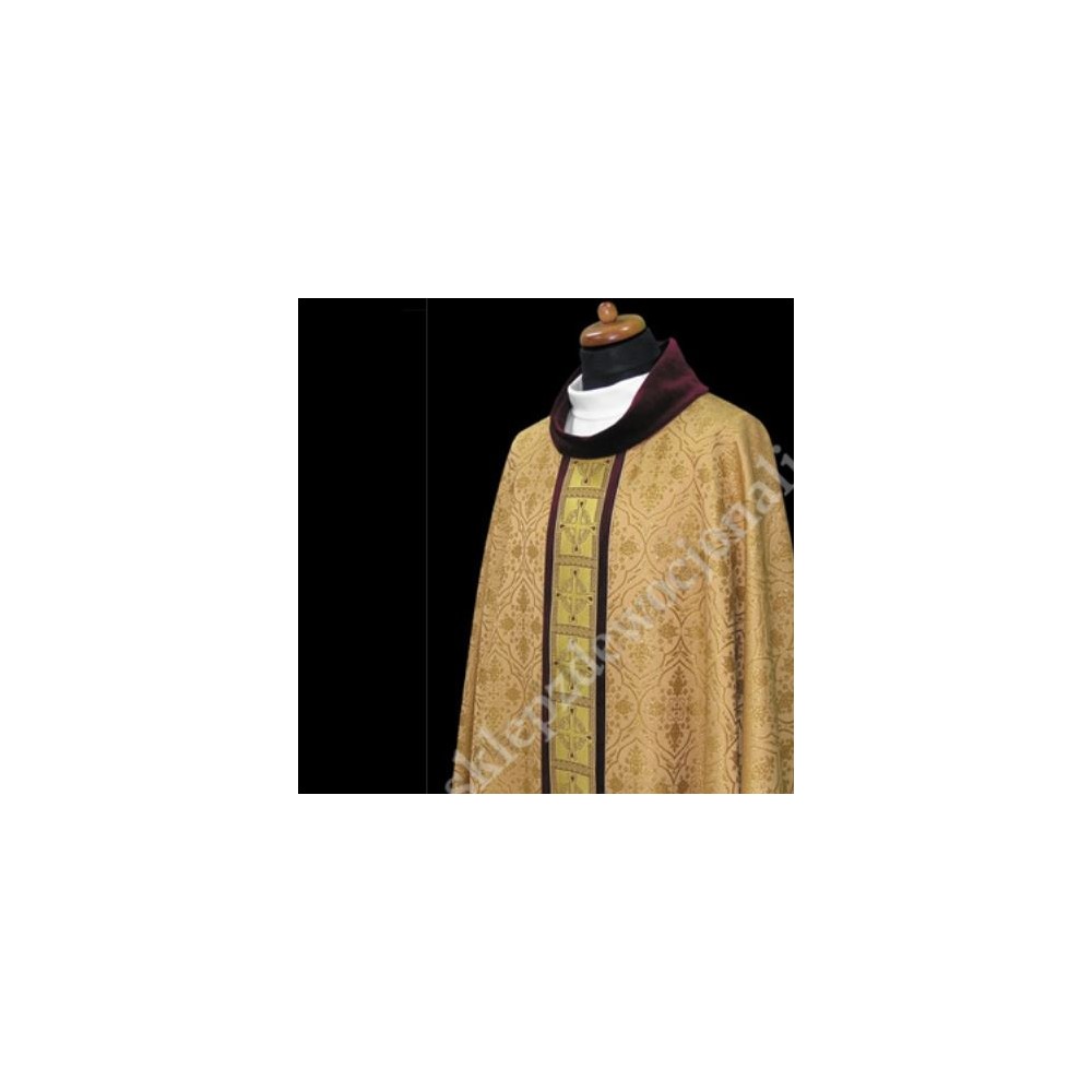 Ornat uszyty z ozdobnego brokatu w stylu monastycznym ze stułą wewnętrzną. Szata liturgiczna ozdobiona galonem naszytym na aksamit, kołnierz również aksamitny.