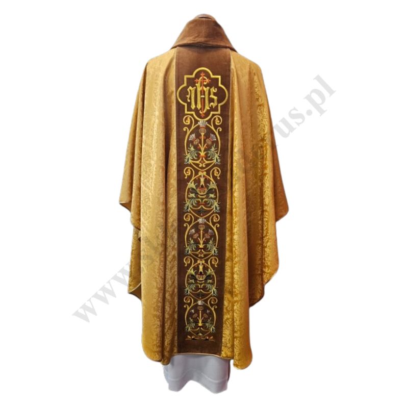 Wyjątkowy ornat wykonany z lekkiej tkaniny typu adamaszek o zaznaczonej strukturze wzoru i połysku. Szata ozdobiona złotym barwnym haftem Eucharystycznym na aksamitnym, miodowym pasie. Centralny element to haftowany na złoto symbol IHS. Kołnierz również aksamitny. W komplecie stuła z stylistyce nawiązującej do ornatu. Szlachetna atłasowa lamówka, złote wypustki nadają szacie wyjątkowy charakter.