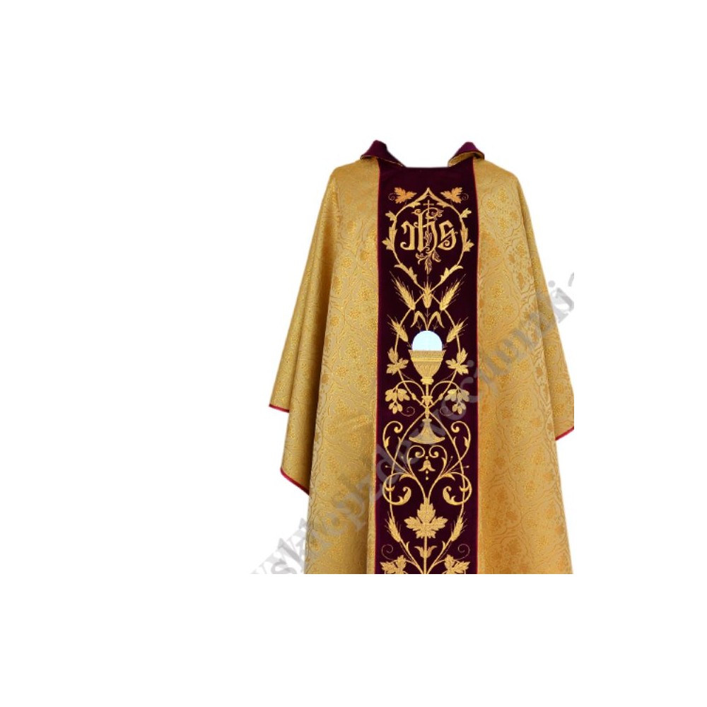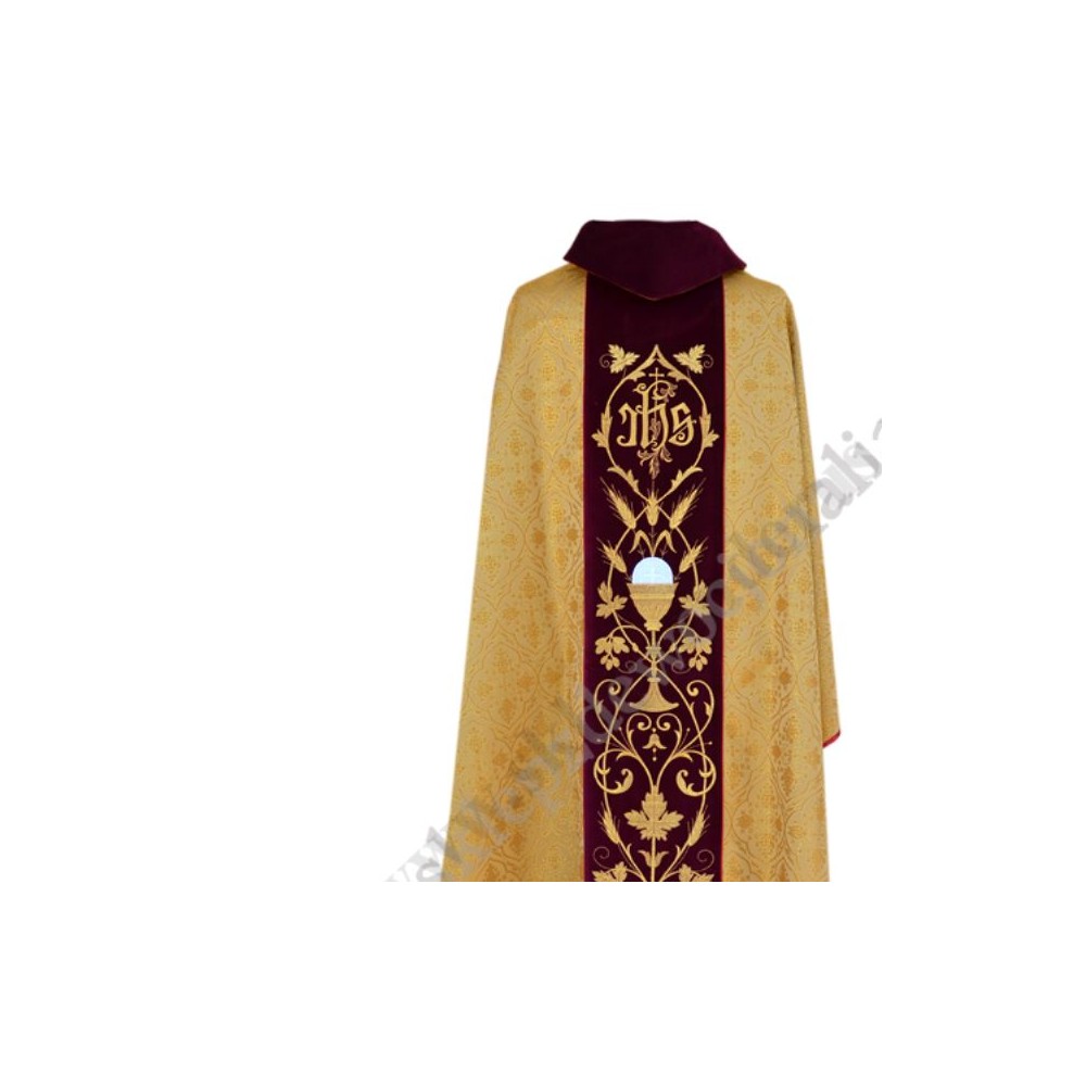Ornat wykonany z wysokiej jakości tkaniny z pasem welurowym zdobiony eucharystycznym, haftowanym komputerowo motywem.