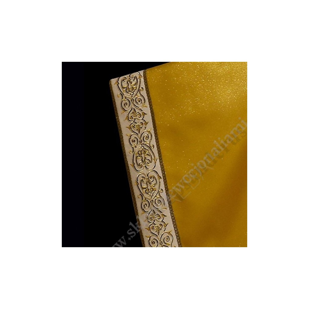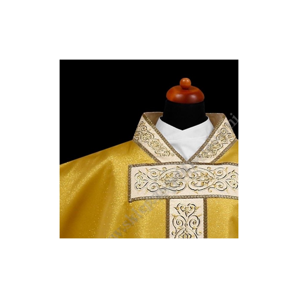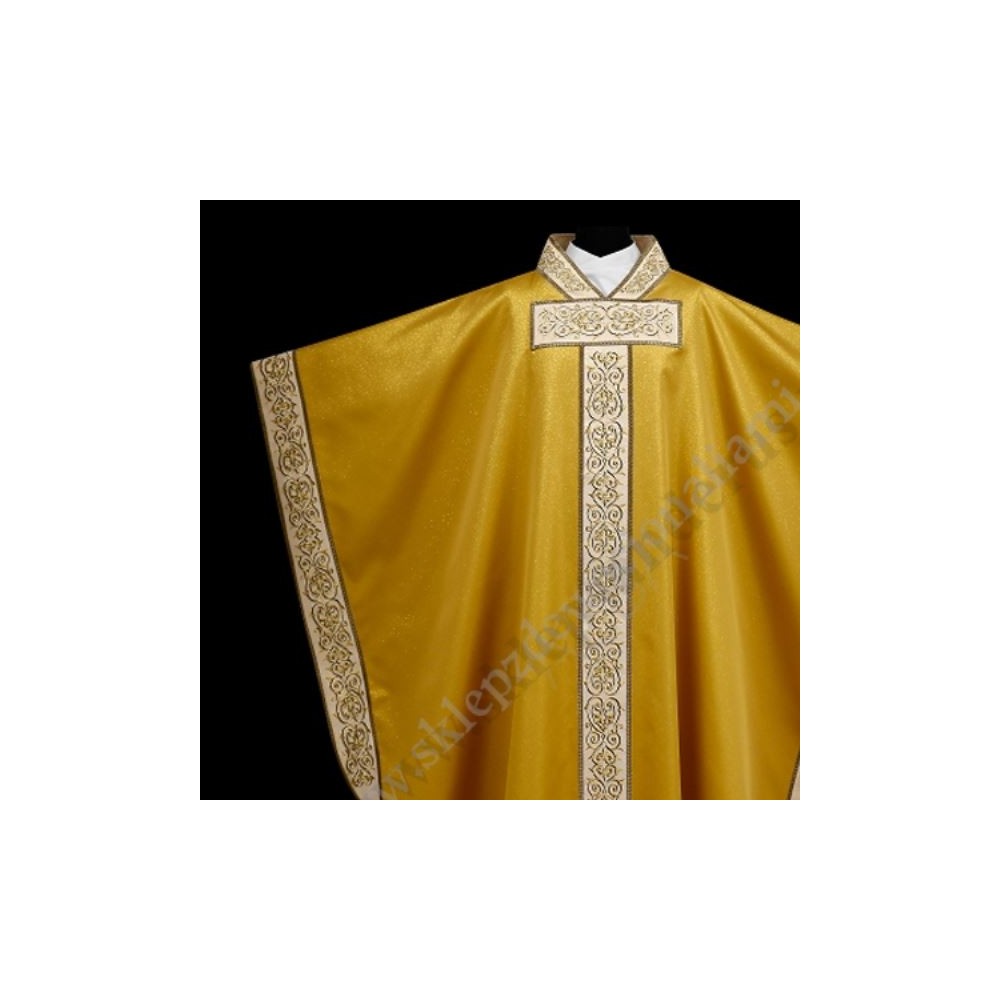 Ornat uszyty z delikatnej tkaniny brokatowej. Bogaty haft wykonany na złotej tkaninie również na bokach, całość ozdobiona złotą taśmą. Ornat ze stułą wewnętrzną.