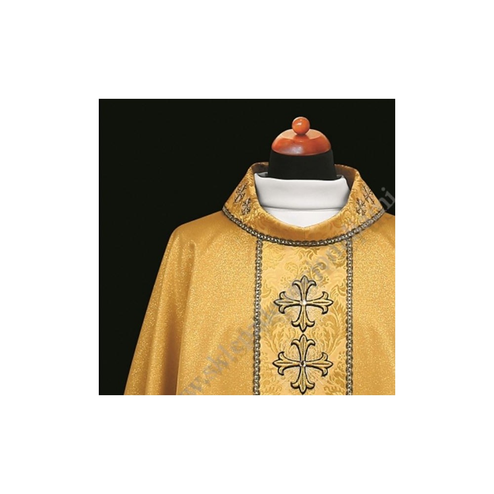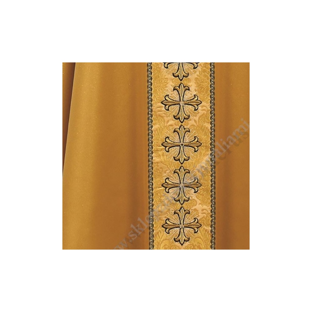 Ornat uszyty z lekkiej nowoczesnej tkaniny brokatowej, wykończony pasem i kołnierzem z brokatu. Haftowane wypukłe krzyże naniesione na pas i ozdobione kamieniem. Kołnierz również haftowany.