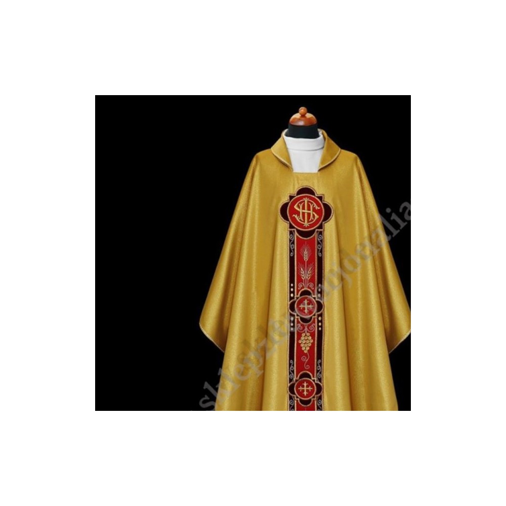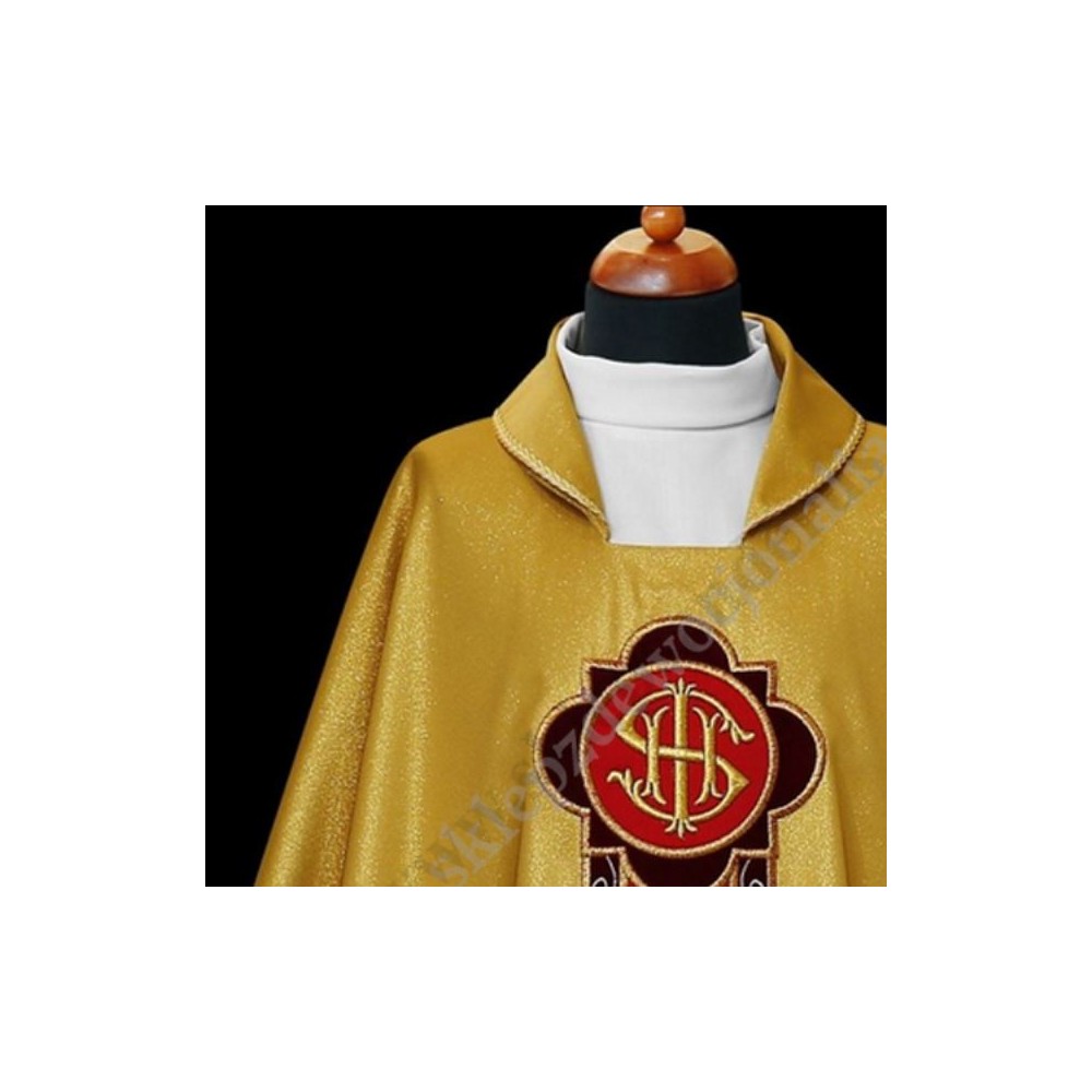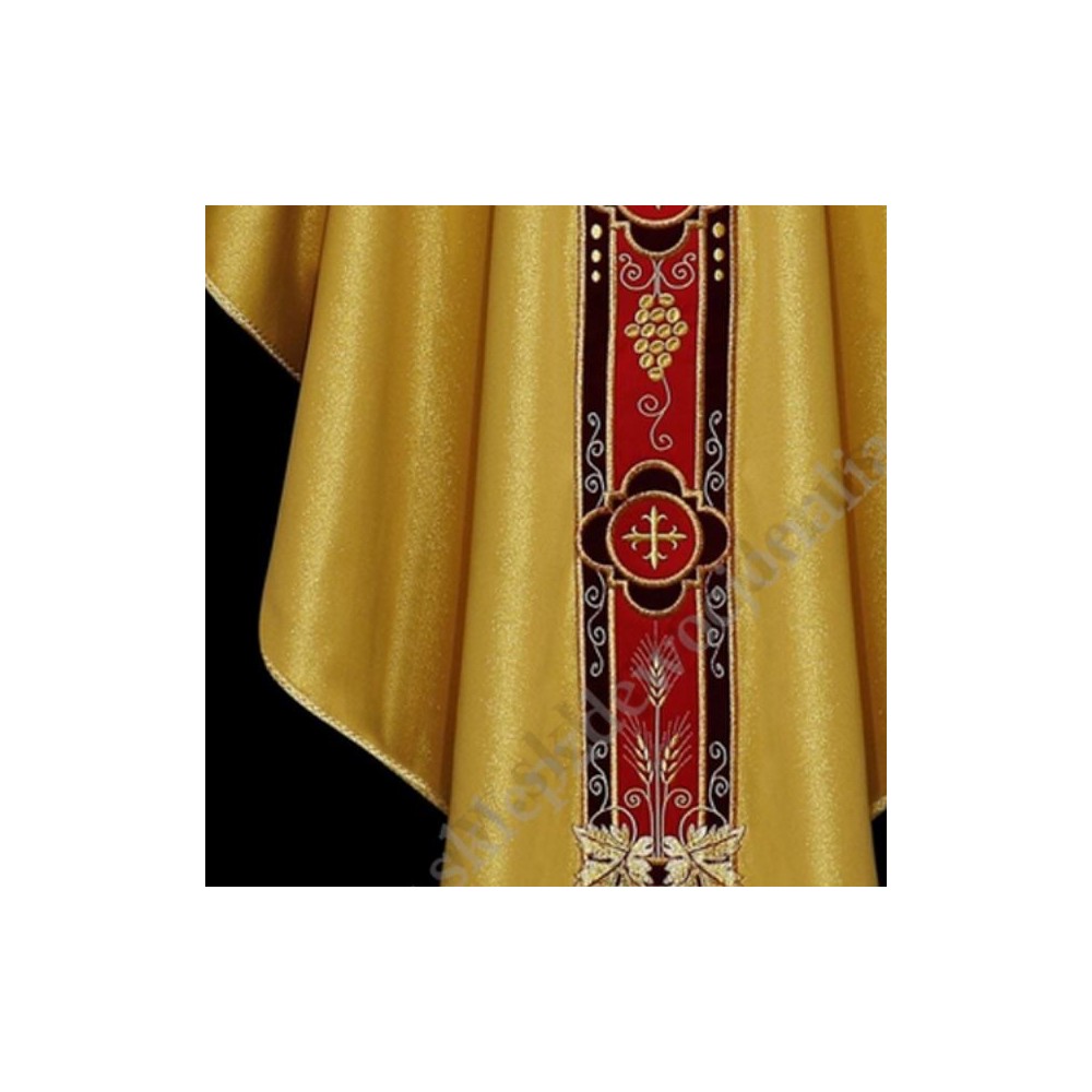 Ornat uszyty z ozdobnej tkaniny brokatowej ozdobiony wypukłym haftem, kombinacja aplikacji z aksamitu i haftu na tkaninie. Haft wzbogacają wstawki z satyny i złotej taśmy.