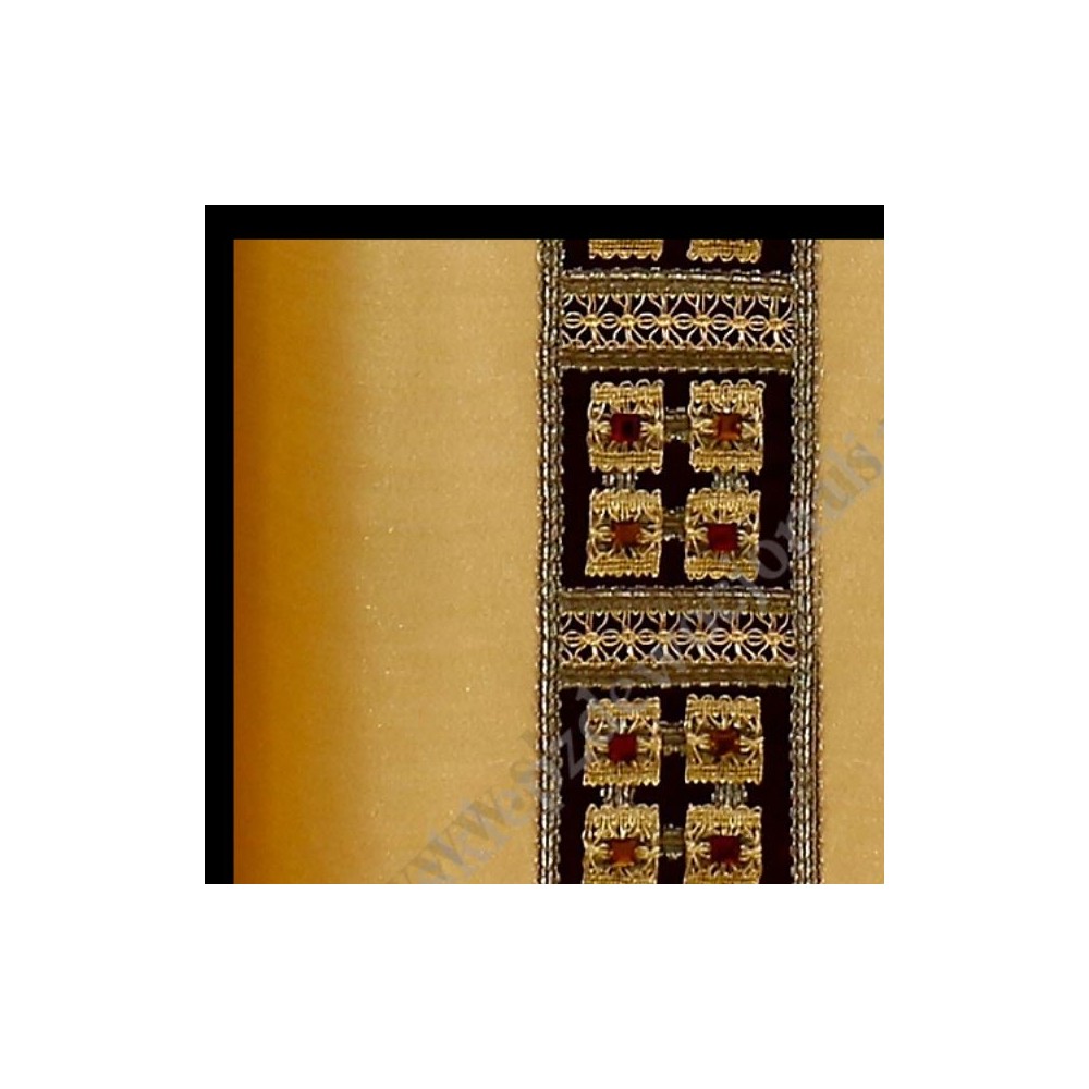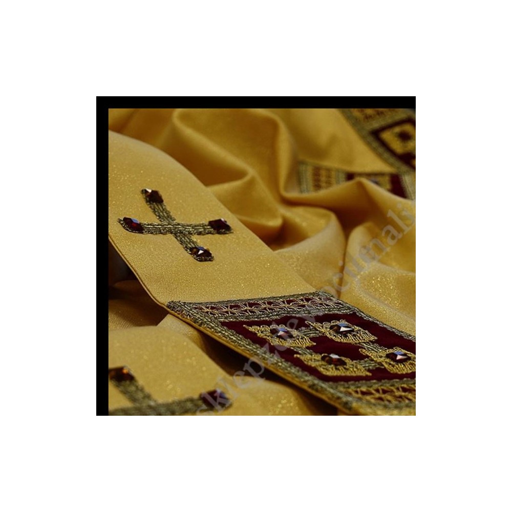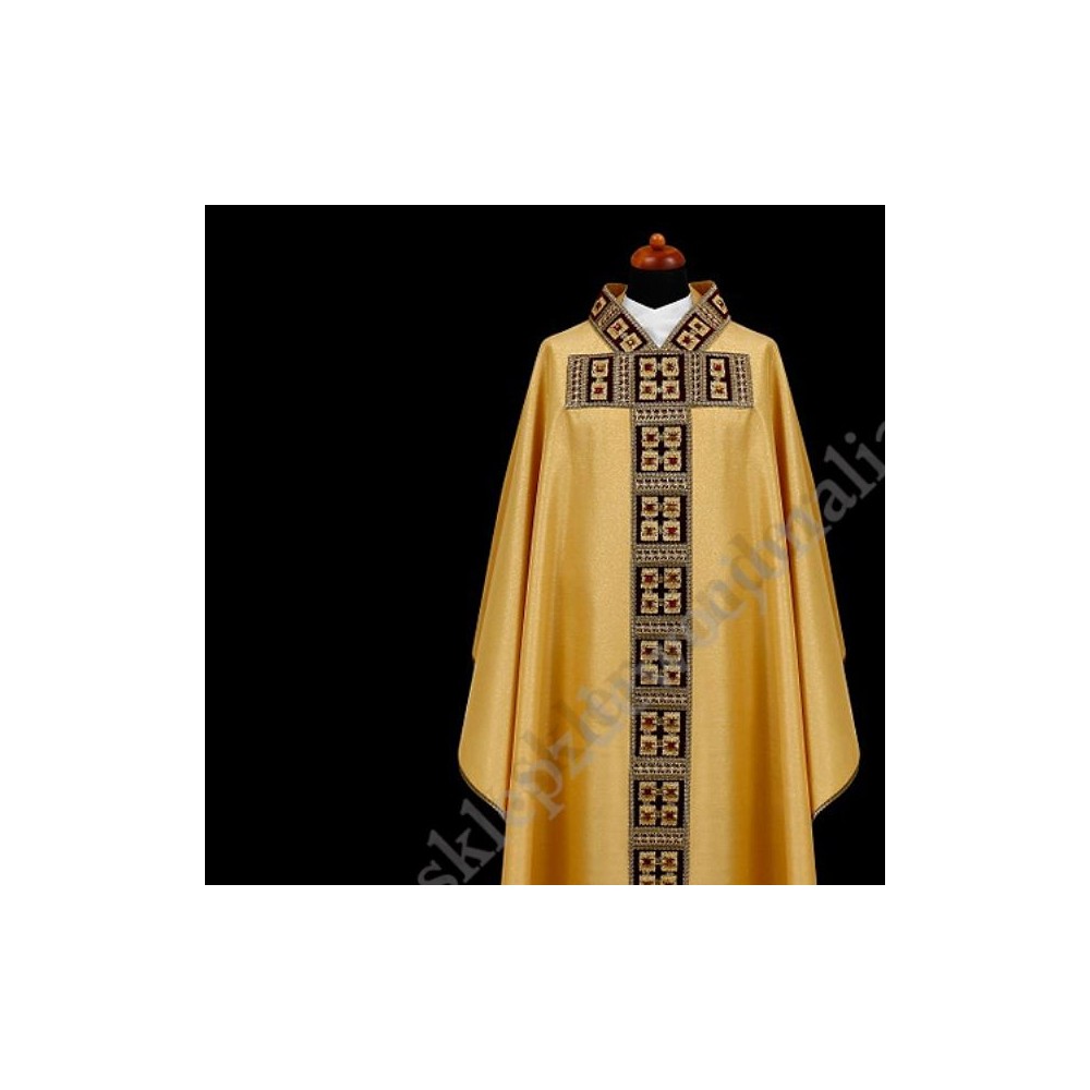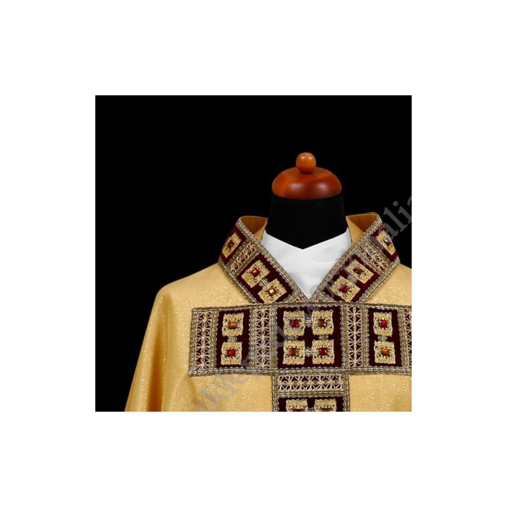 Ornat uszyty z ozdobnej tkaniny brokatowej z domieszką wełny, z ręcznie naszywanymi ozdobami z taśm i kamieniami na bordowym aksamicie. Stuła wewnętrzna również z bogatymi zdobieniami.