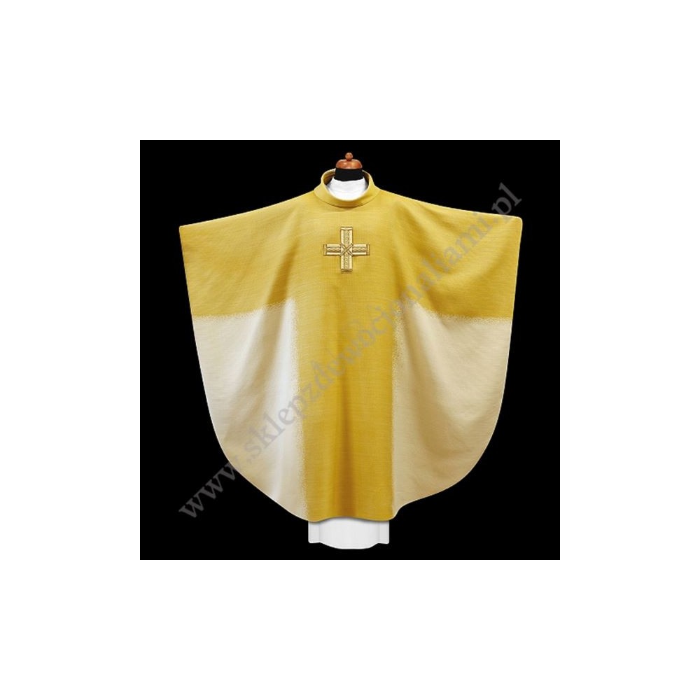 Ornat ręcznie tkany wełniany ze stułą wewnętrzną uszyty w stylu monastycznym. Szata liturgiczna ozdobiona aplikacją złotych taśm.