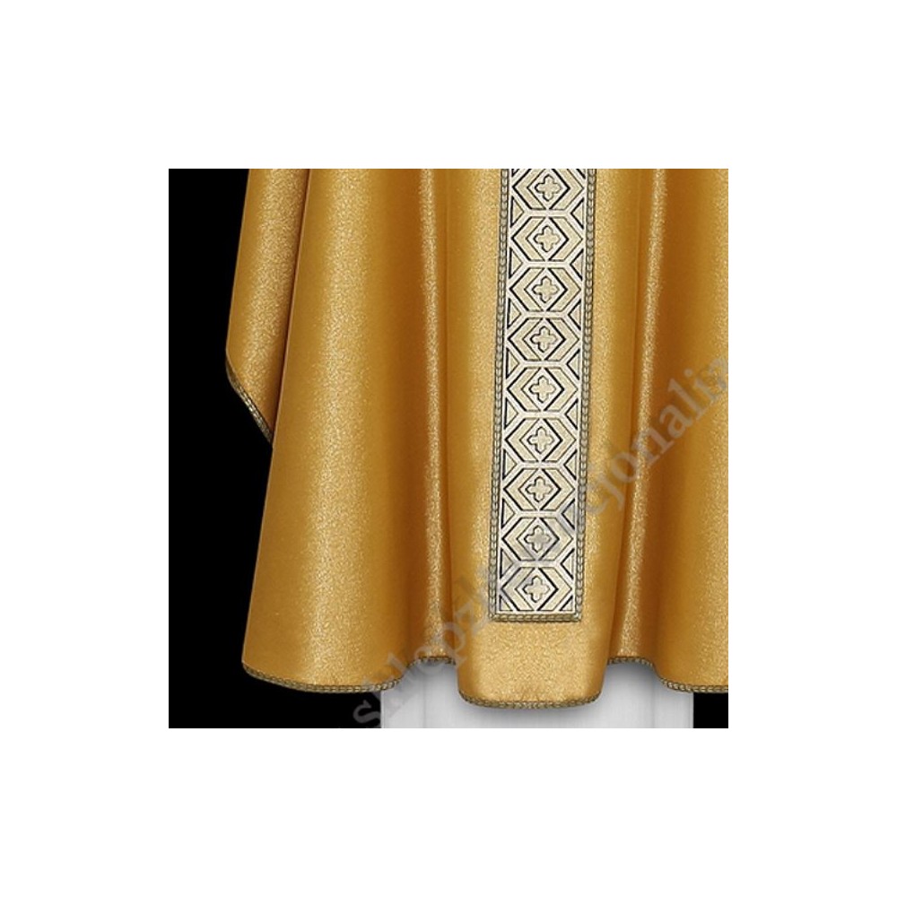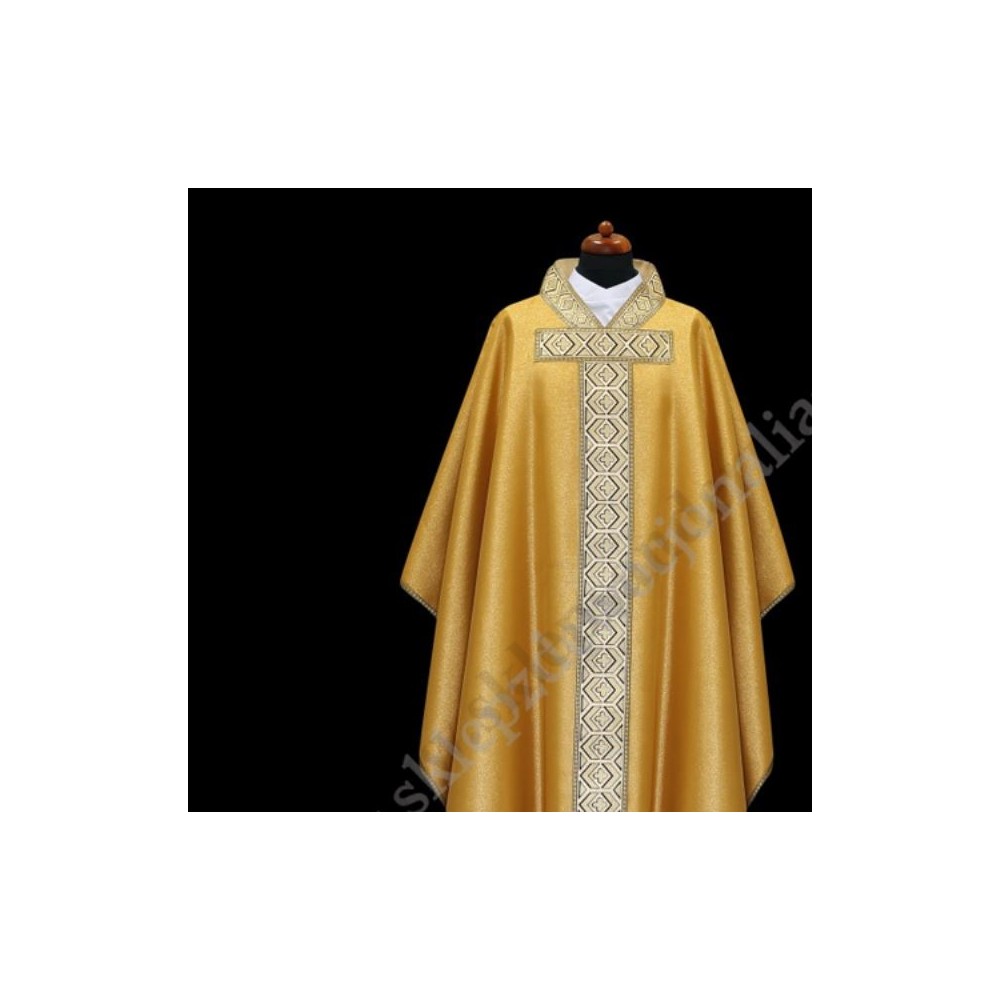Bogato haftowany ornat uszyty z lekkiej brokatowej tkaniny ozdobiony złotą pasmanterią.