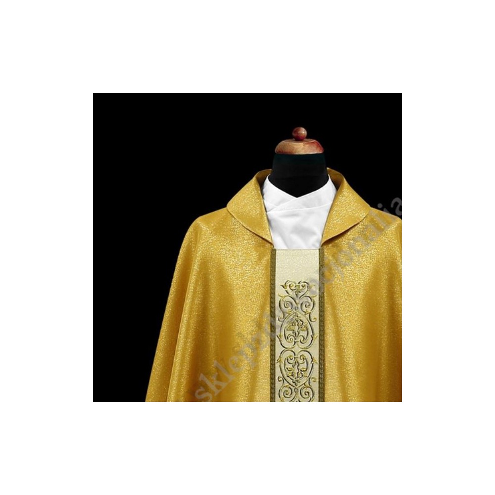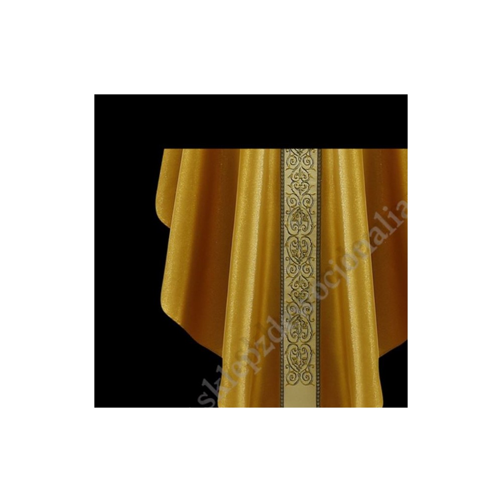 Ornat uszyty z delikatnej tkaniny brokatowej. Bogaty haft na ornacie wykonany na złotej tkaninie. Ornat ze stułą wewnętrzną.