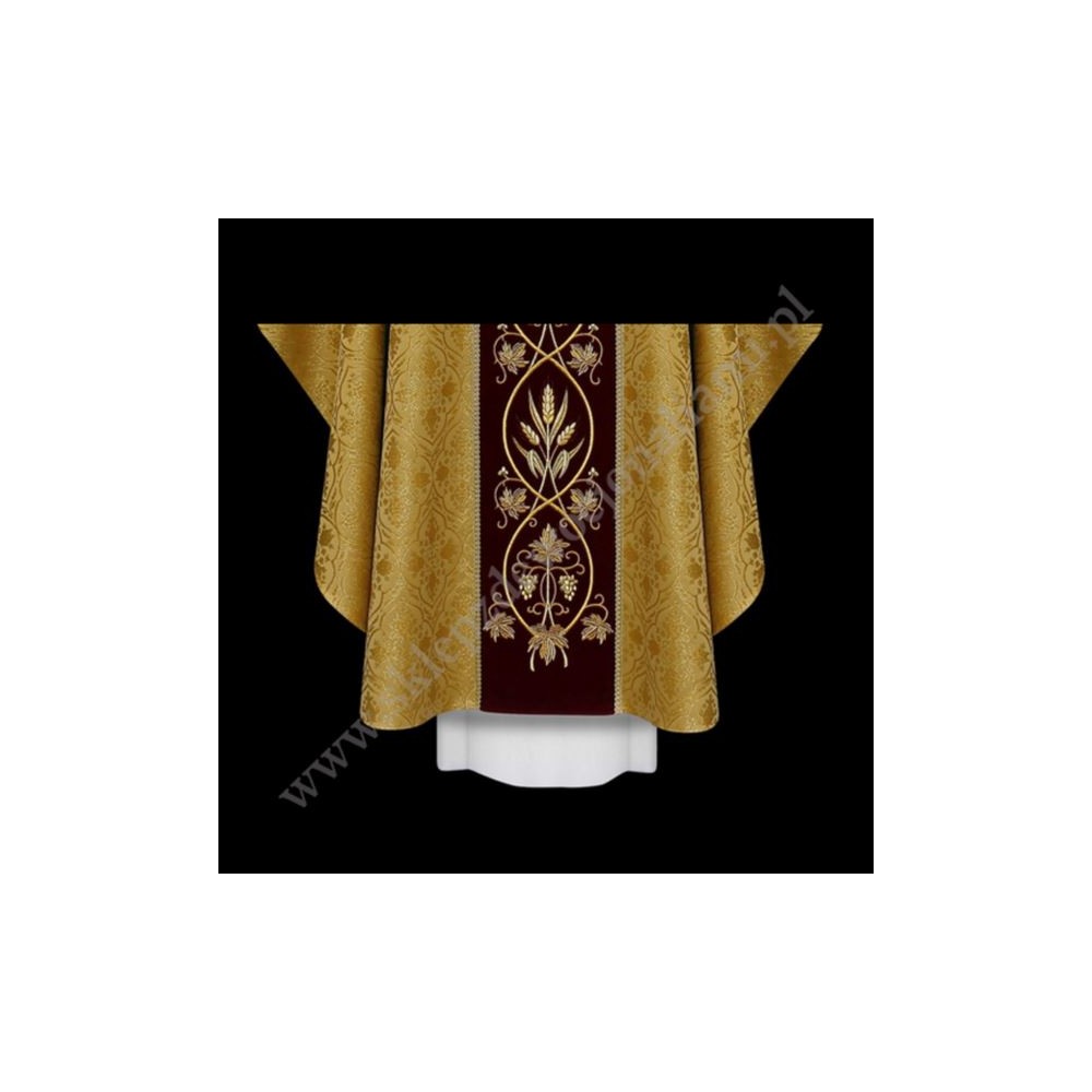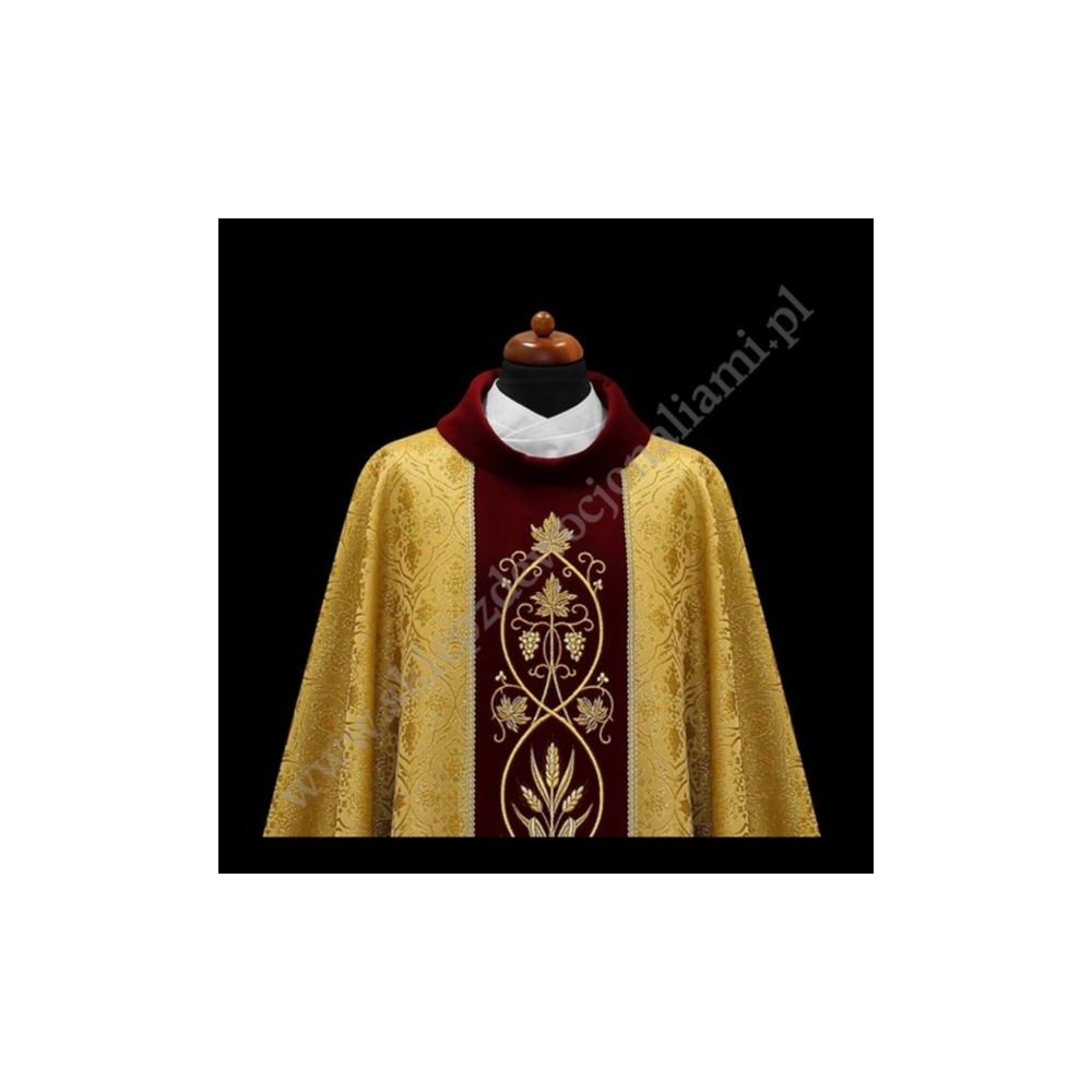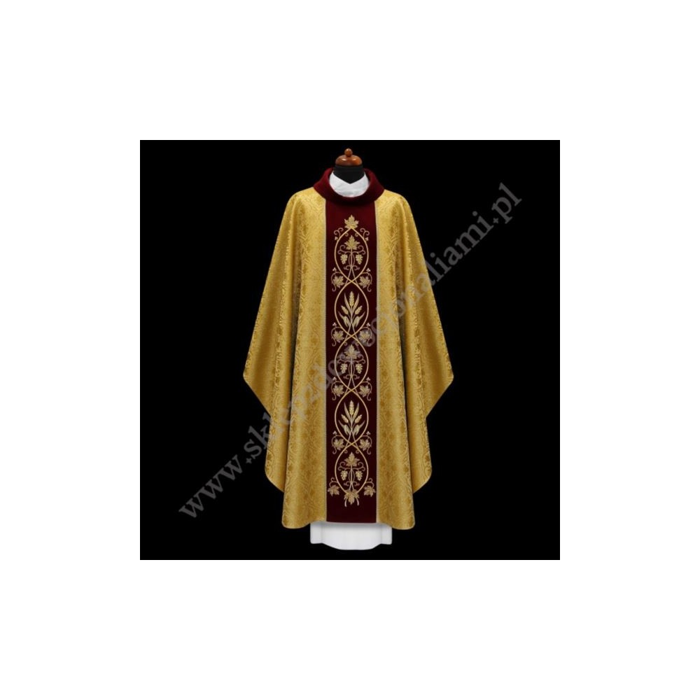 Ornat uszyty z ozdobnej miodowo-brokatowej tkaniny z bogatym złotym haftem Eucharystycznym na szerokim aksamitnym pasie.Kołnierz również aksamitny.