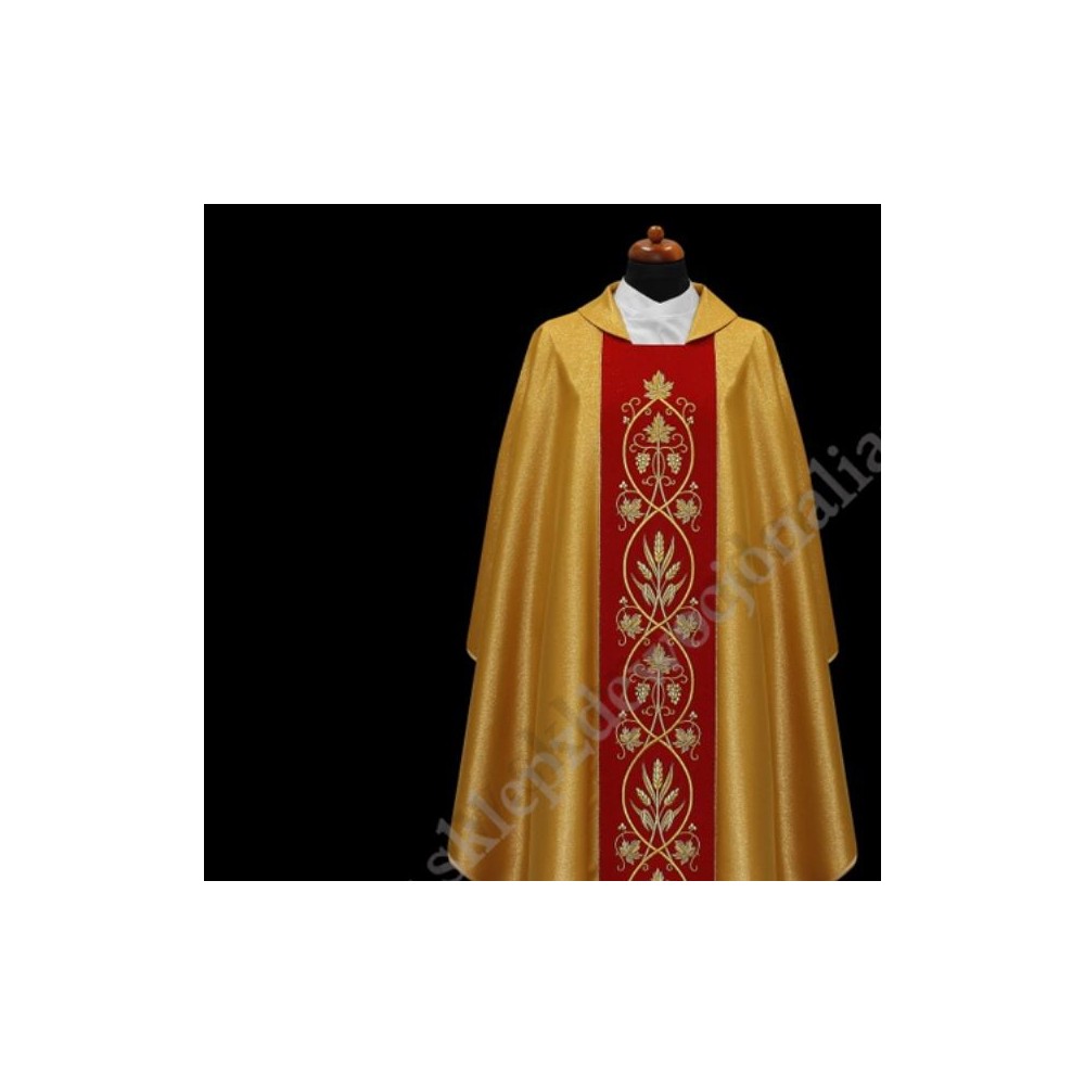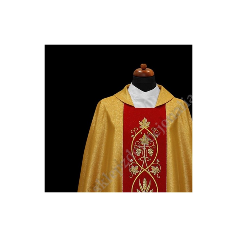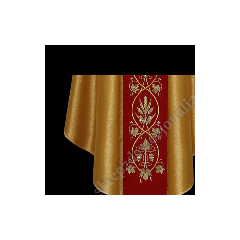Ornat bogato haftowany , uszyty z miodowo-złotej tkaniny w stylu gotyckim ze stułą wewnętrzną.