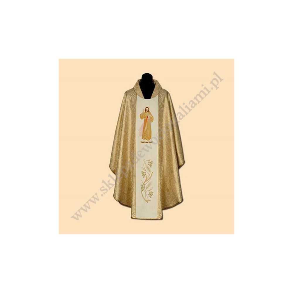 Ornat z materiału imitującego złoto, pas haftowany motywami eucharystycznymi, na pasie wyhaftowany jest również wizerunek Jezu Ufam Tobie