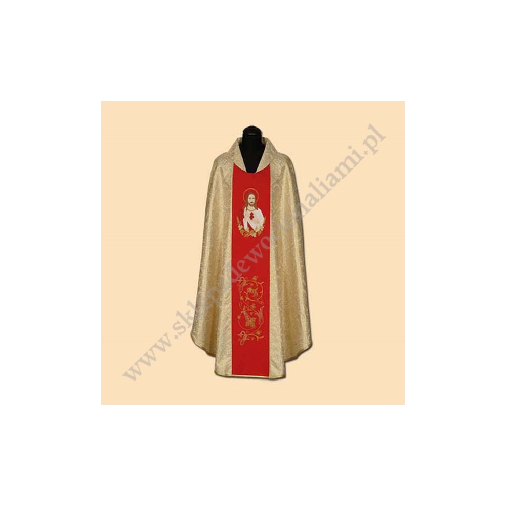 Ornat z materiału imitującego złoto, pas haftowany motywami eucharystycznymi, na pasie wyhaftowany jest również wizerunek Serca Pana Jezusa