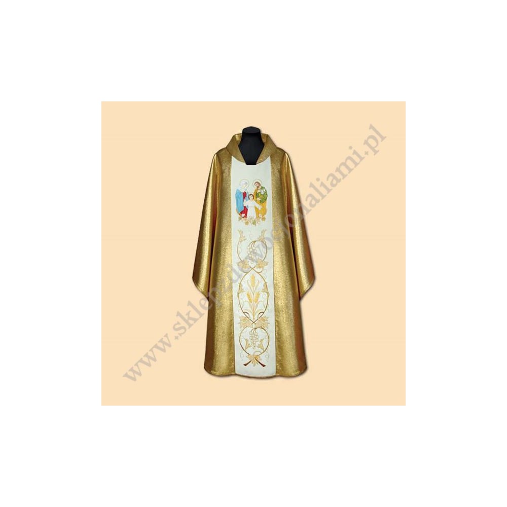 Ornat z materiału imitującego złoto, pas haftowany motywami eucharystycznymi, na pasie wyhaftowany jest również wizerunek Świętej Rodziny